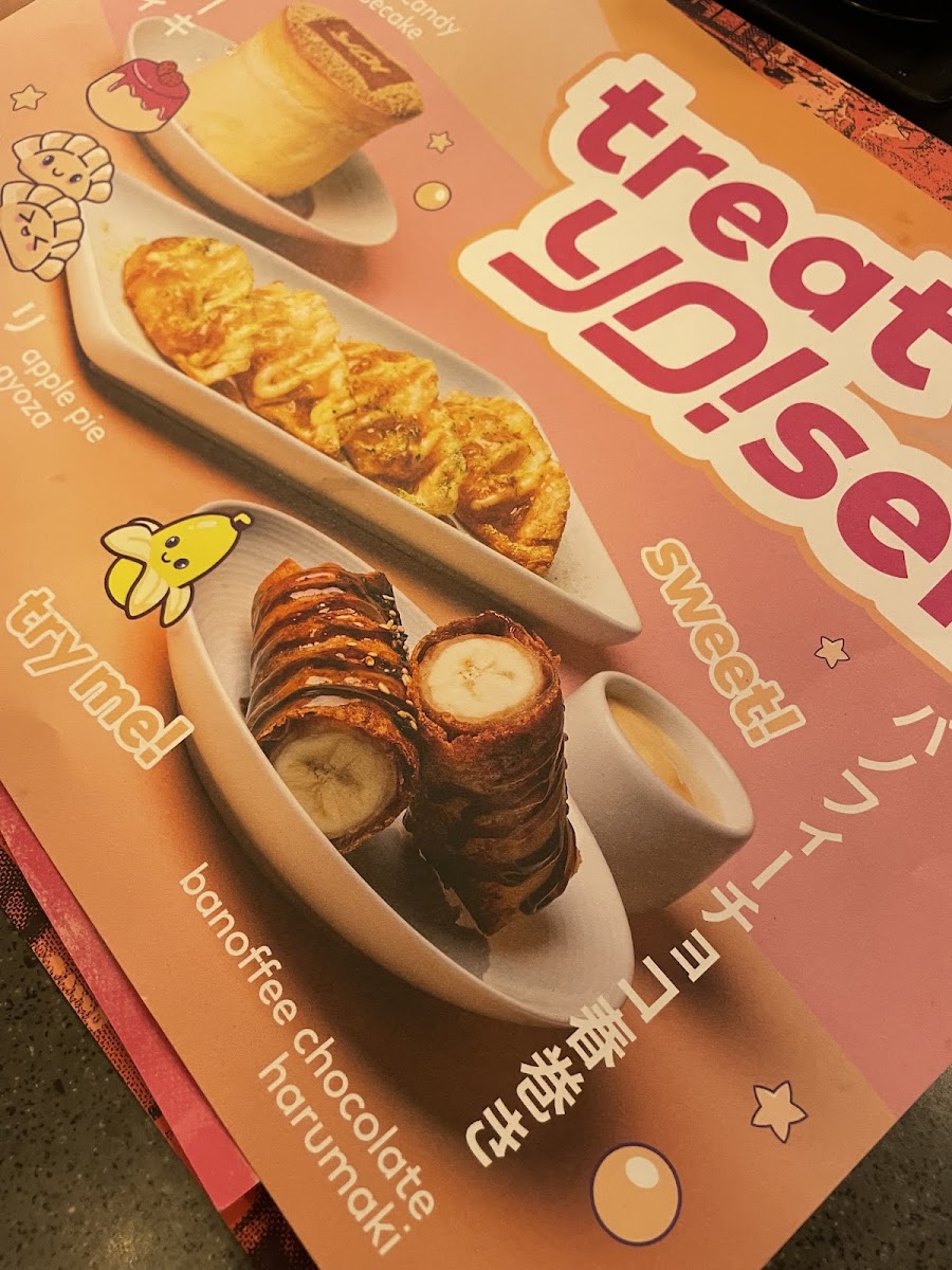 Your chocie of gyoza topped with Korean ketchup, shichimi, mayo, crispy & spring onions. choose from veggie, chicken or prawn